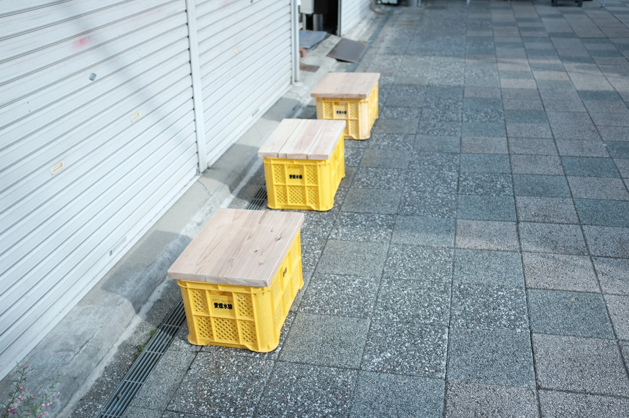 商店街の路上にみかん箱を活用した椅子とテーブルをデザイン製作。